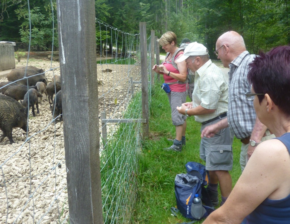 Am Samstag stand der „Schlossfelsenpfad“ bei Albstadt-Ebingen auf dem Programm. Zunächst bestimmte die idyllische Wacholderheide die Landschaft, bevor wir vorbei an einem großen Wildschweingehege das Naturfreundehaus „Waldheim“ mit einem großen Biergarten erreichten. Eine willkommene kühle Abwechslung – es war kurz vor Mittag, die Sonne brannte und das Bier war gut gekühlt.