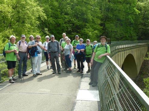 Unter Führung von Kathi und Gerhard Otterbach erwanderten 19 Teilnehmer die alte Trasse der Härtsfeldbahn bei Unterkochen. Dieses Gruppenfoto entstand auf dem Härtsfeldbahnviadukt: