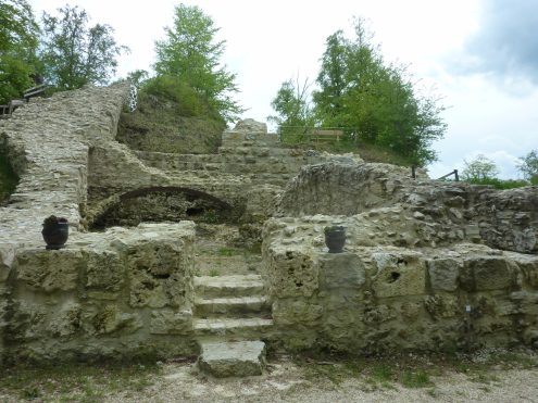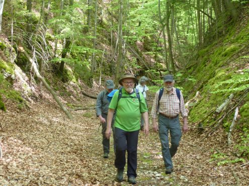 Nach der Mittagsrast ging es zunächst eben weiter. Dann erwartete uns ein sehr steiler Aufstieg auf einem unmarkierten Pfad zum Hohlen Stein. Schließlich erreichten wir die Burgruine Kocherburg.
