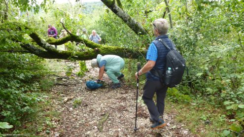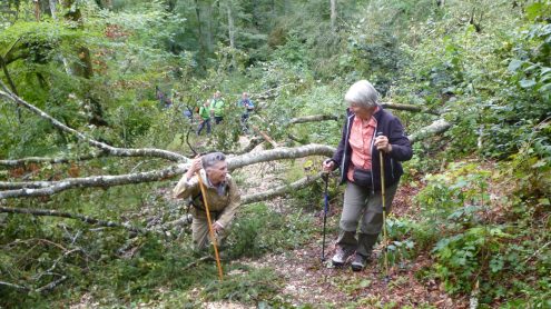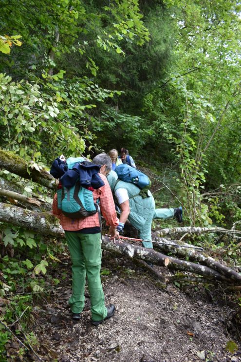 Schon bei der Anfahrt begann die 1. Wanderung bei Inzigkofen. Ein Sturm hatte leider einige Tage vorher für eine Unzahl umgestürzter, teilweise riesiger Buchenstämme gesorgt. Diese versperrten die Wanderstrecke auf zahlreichen Abschnitten und mussten äußerst mühsam überklettert, unter ihnen durchgekrochen oder durchs Unterholz umgangen werden. Eine grenzwertige Erfahrung! Die folgenden Bilder zeigen nur einfache Hindernisse – bei den weitaus größeren Anforderungen hatte keiner Zeit zum fotografieren! Nur raus hier aus dem Dickicht….und wieder den richtigen Weg finden!