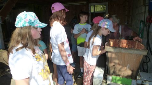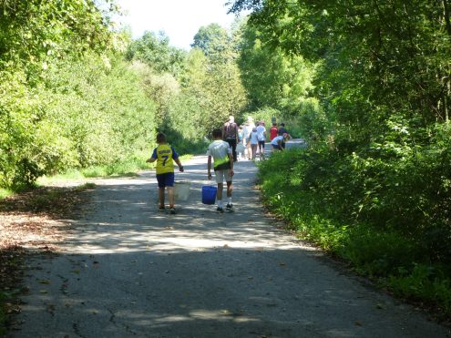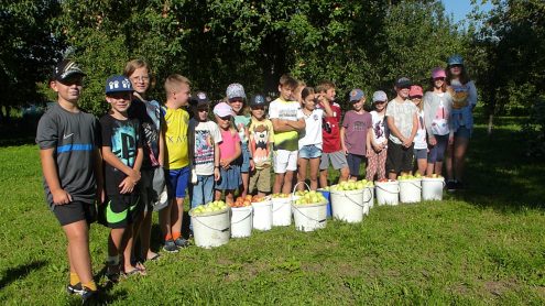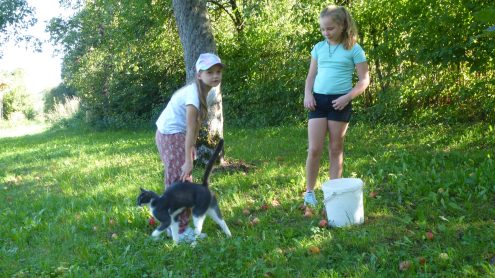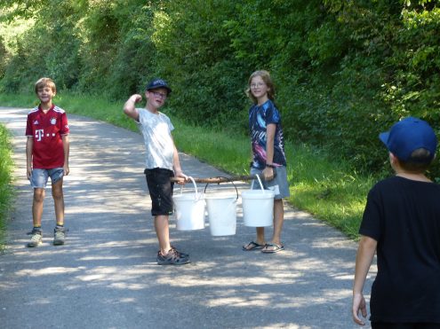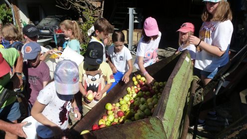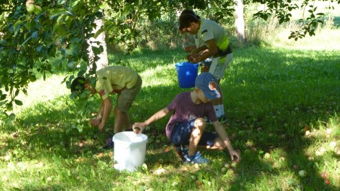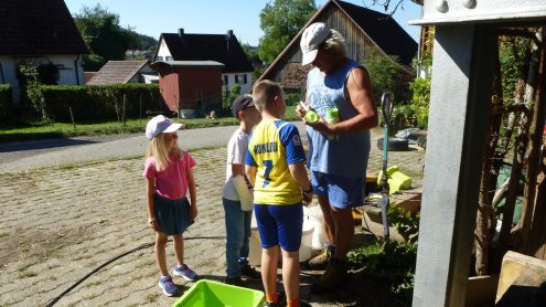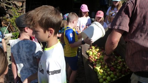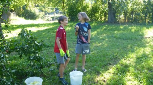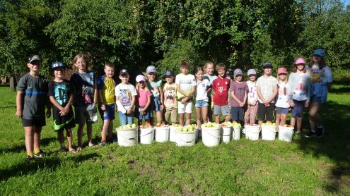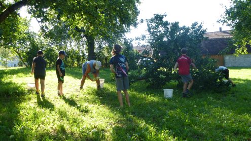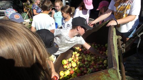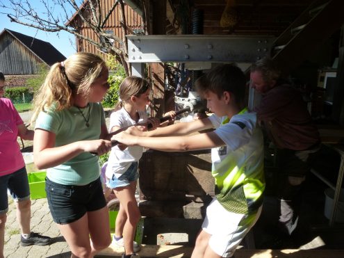 Neue Erfahrungen konnten 19 Kinder zwischen 7 und 14 Jahren bei diesem Punkt des Ferienprogramms sammeln. Es ist schon spannend, zunächst Äpfel aufzulesen und wenig später dann den frisch gepressten Apfelsaft zu genießen! Mit Eimern bewaffnet machte sich die Gruppe auf zur Obstwiese. Rote, grüne, gelbe, kleine und große Äpfel – es gab sehr unterschiedliche Sorten, mit denen die Eimer recht schnell gefüllt waren.