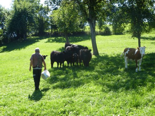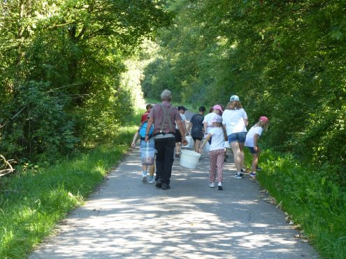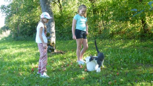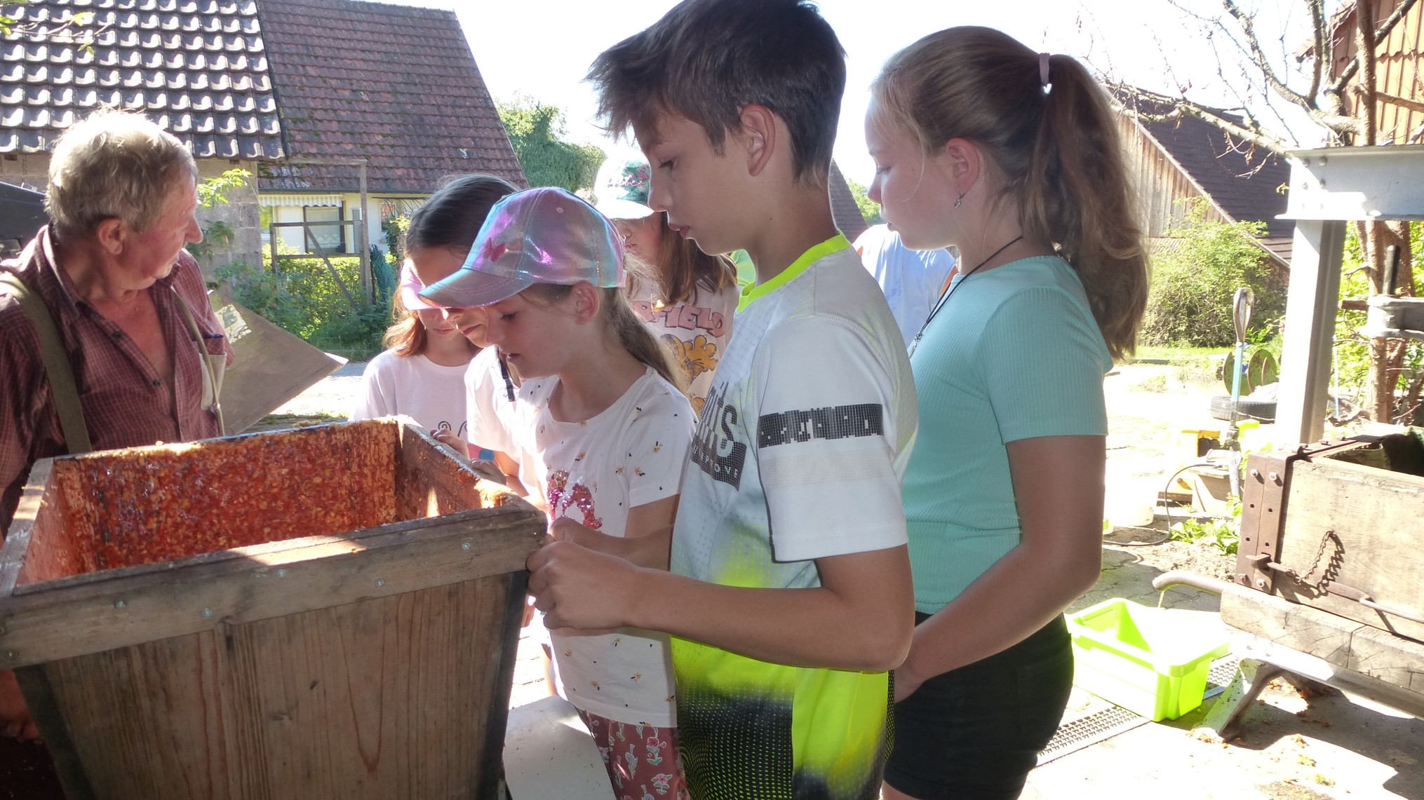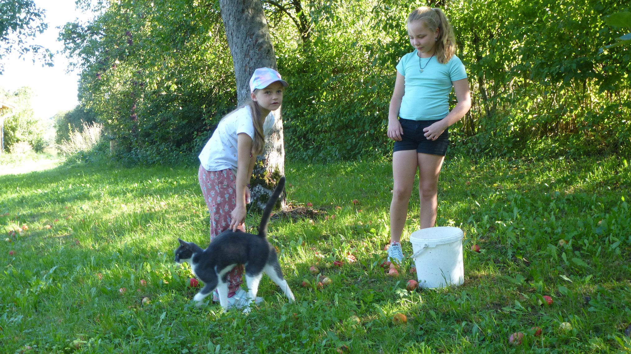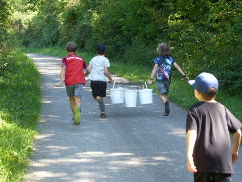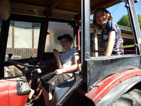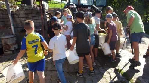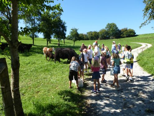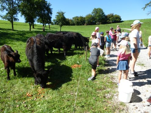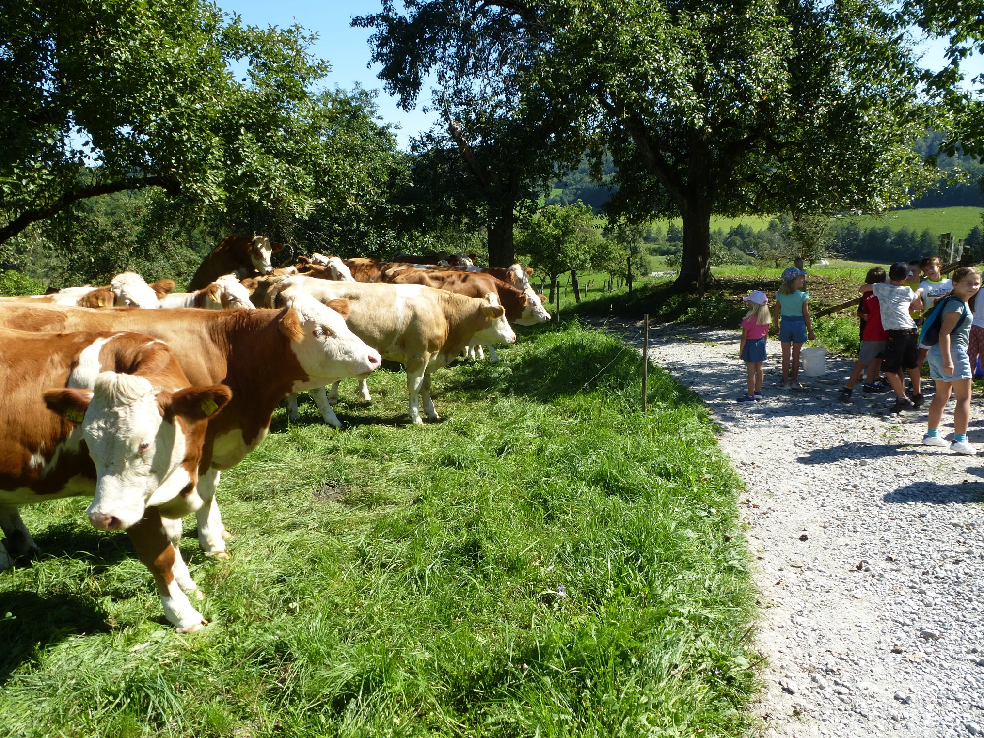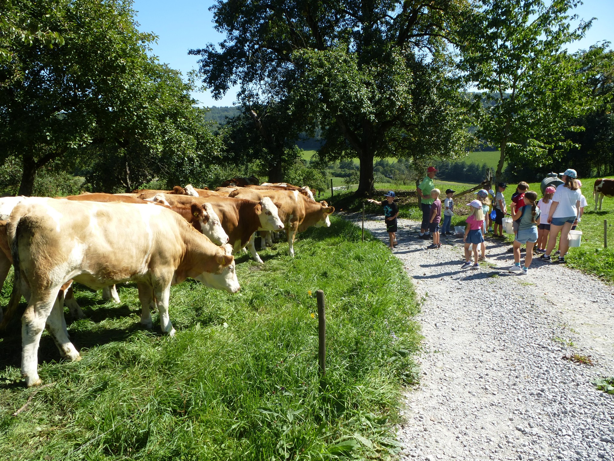 Den Trester (Rest vom Apfel nach dem Pressen) füllten wir in Eimer und brachten diesen nach einer kleinen Wanderung den Kühen auf der Weide zum Fressen. Für diese ist das ein richtiger Leckerbissen!