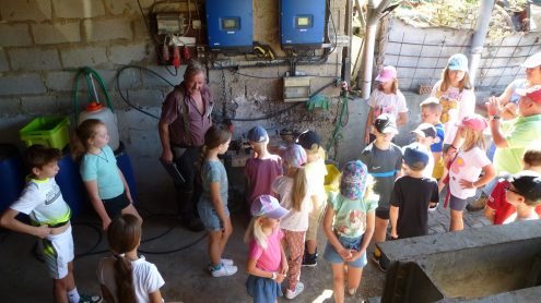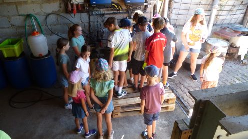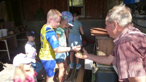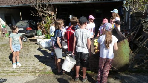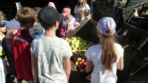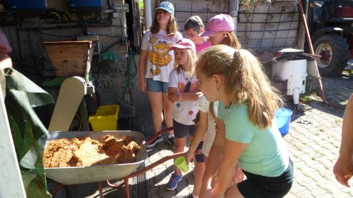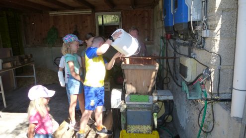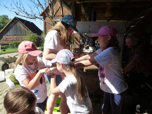 Zurück am Bauernhof wurden die notwendigen Geräte – Obstmühle und Presse erklärt. Das Obst schütteten wir zum Waschen in die Frontladerschaufel des Traktors. Damit alle Kinder den Herstellungsprozess ganz nah sehen konnten bildeten wir 3 Gruppen. Jeweils eine bei der Saftherstellung, eine beantwortete ein Apfelquiz während die 3. Gruppe Hühner und sonstiges auf dem Bauernhof besichtigte.