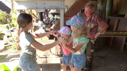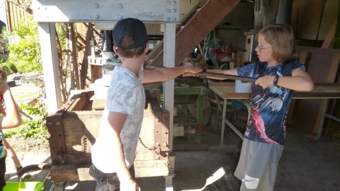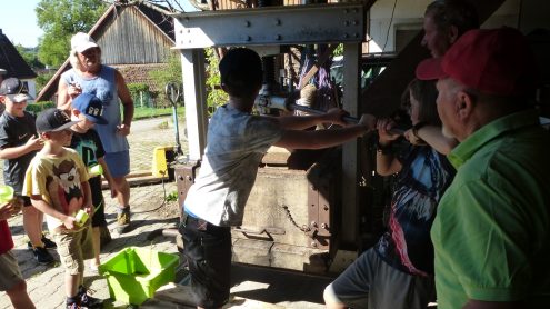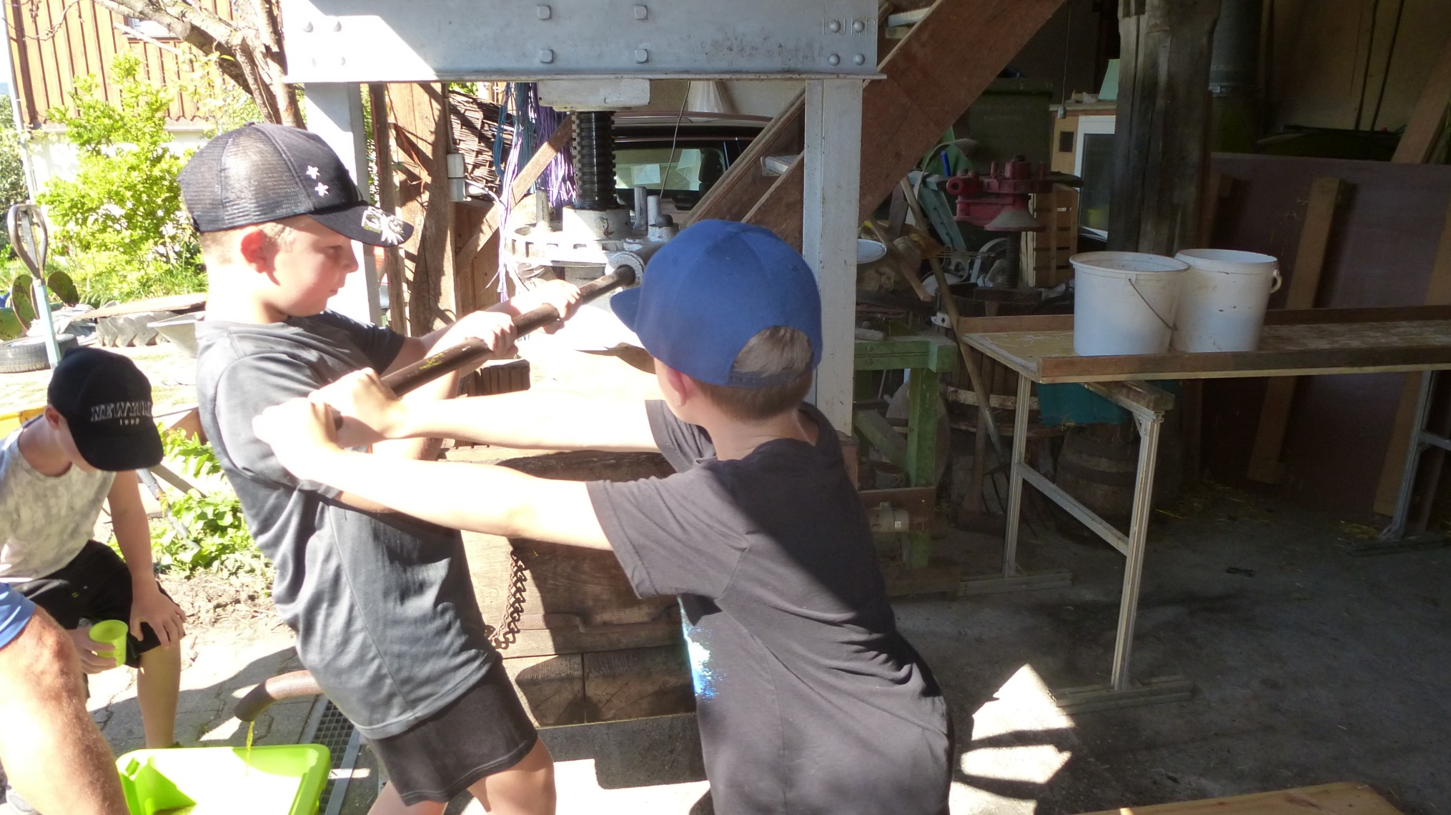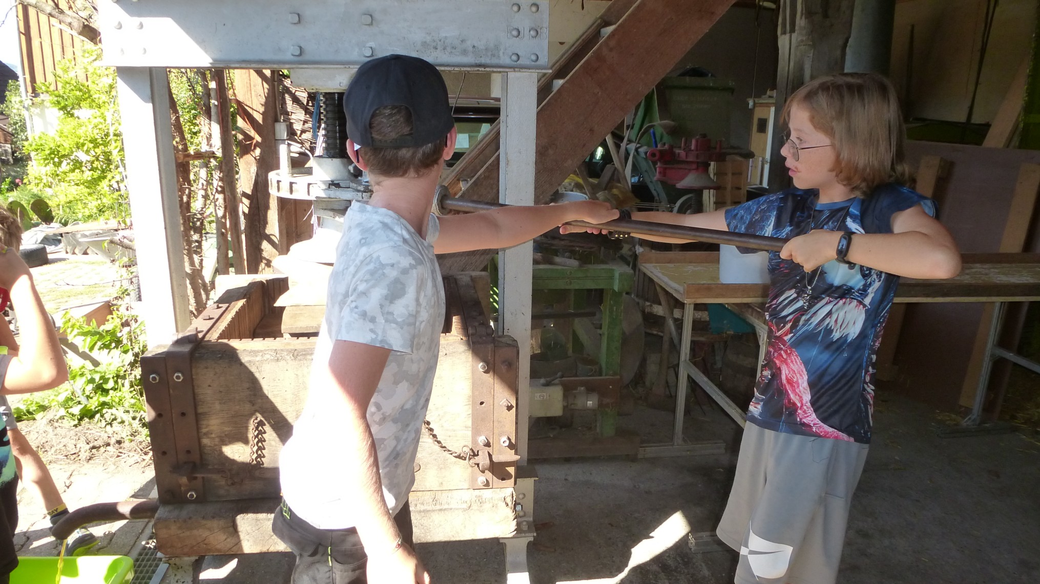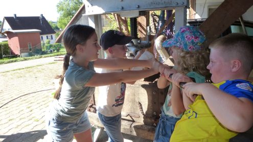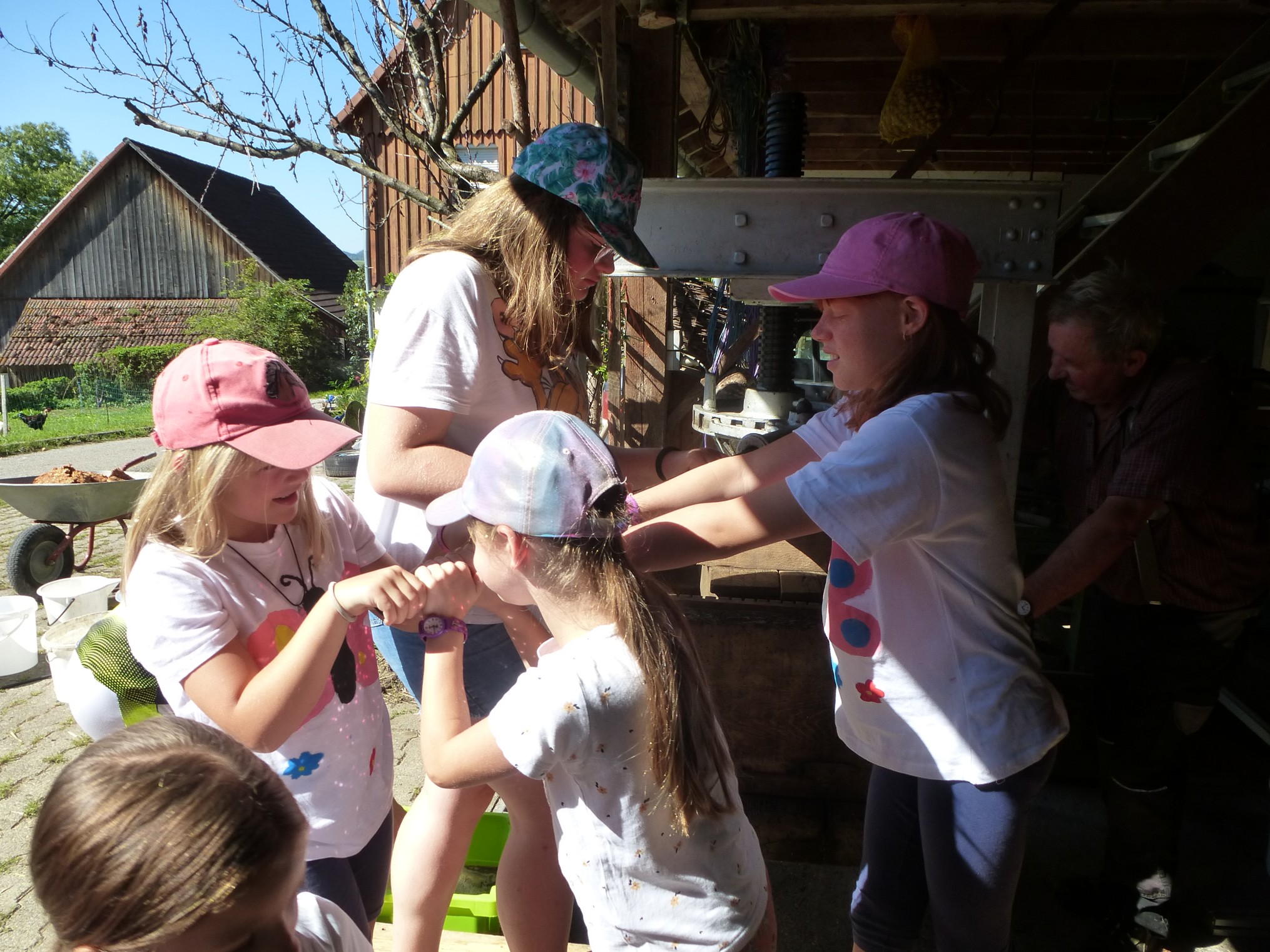 Aus der Frontladerschaufel füllten wir die Eimer wieder mit den gewaschenen Äpfeln – ab damit in die Obstmühle, diese zerkleinerte die Äpfel zu grobem Apfelmus. An der Presse wurden dann alle Kids gefordert – alle durften beim Pressen helfen. Da waren richtig starke Jungs und Mädels dabei! Der gewonnene Saft konnte direkt von der Presse mit Bechern probiert werden – hmh, lecker! – das war die einhellige Meinung!