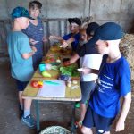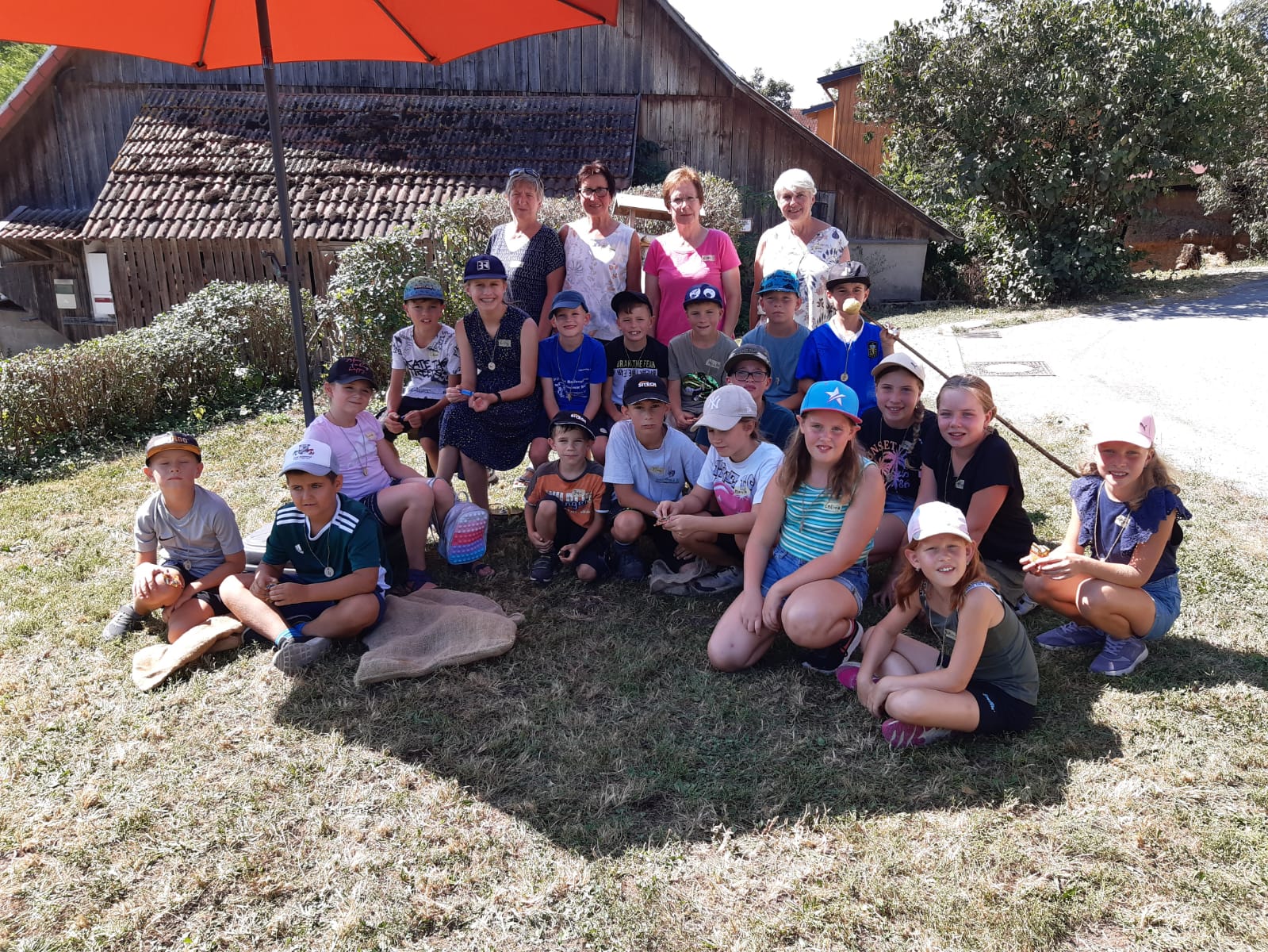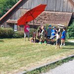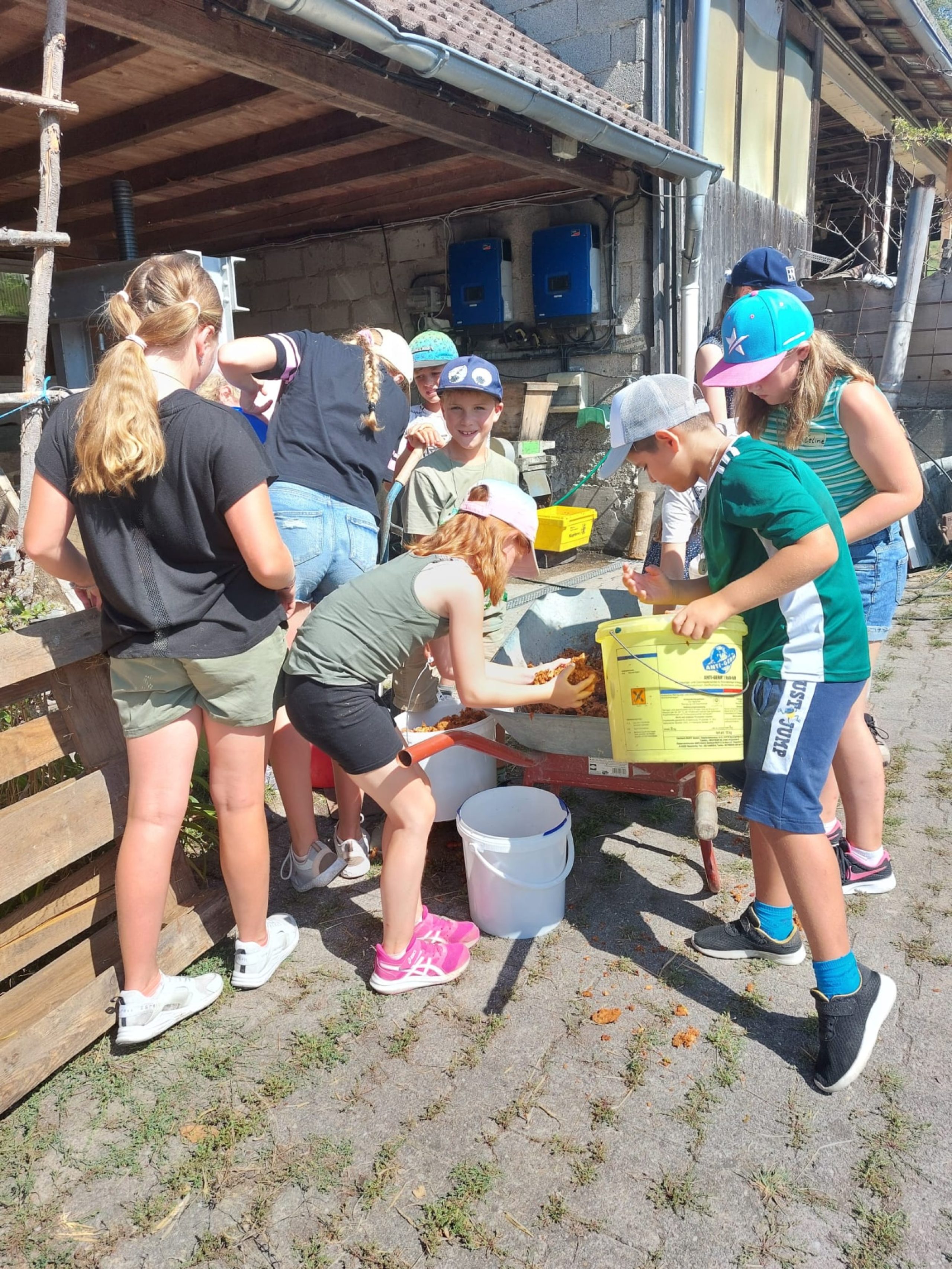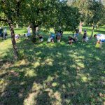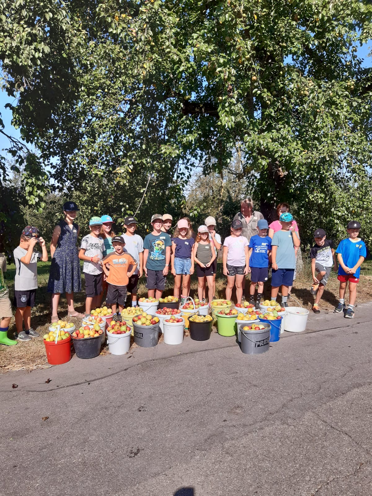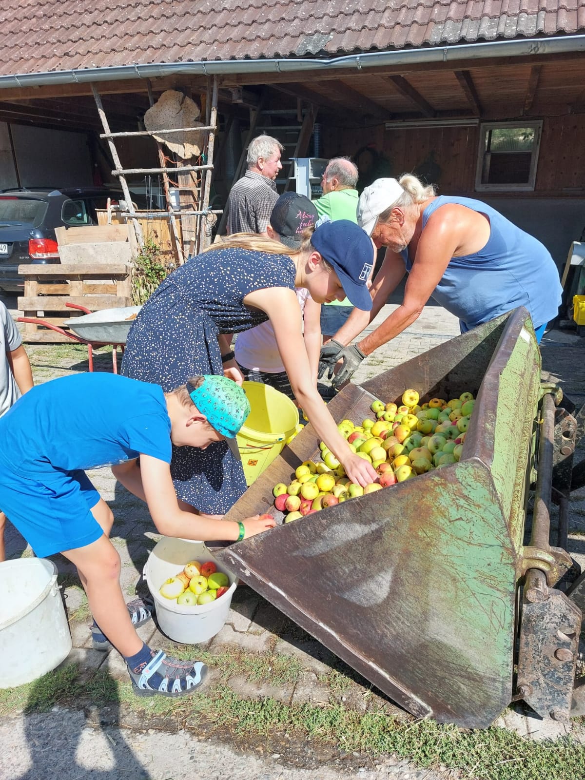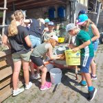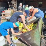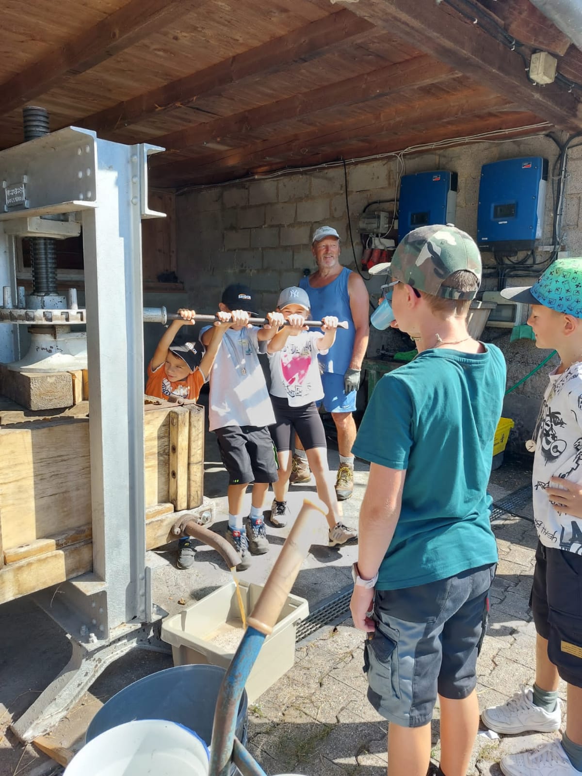 Wie im Vorjahr haben wir uns am Ferienprogramm der Gemeinde Obersontheim mit der Herstellung von Apfelsaft beteiligt. 20 Kinder waren eifrig beim Äpfel auflesen, Obst waschen, mahlen und pressen dabei. Der Trester wurde anschließend mit einer kleinen Wanderung auf die Viehweide gebracht und den Kühen verfüttert.