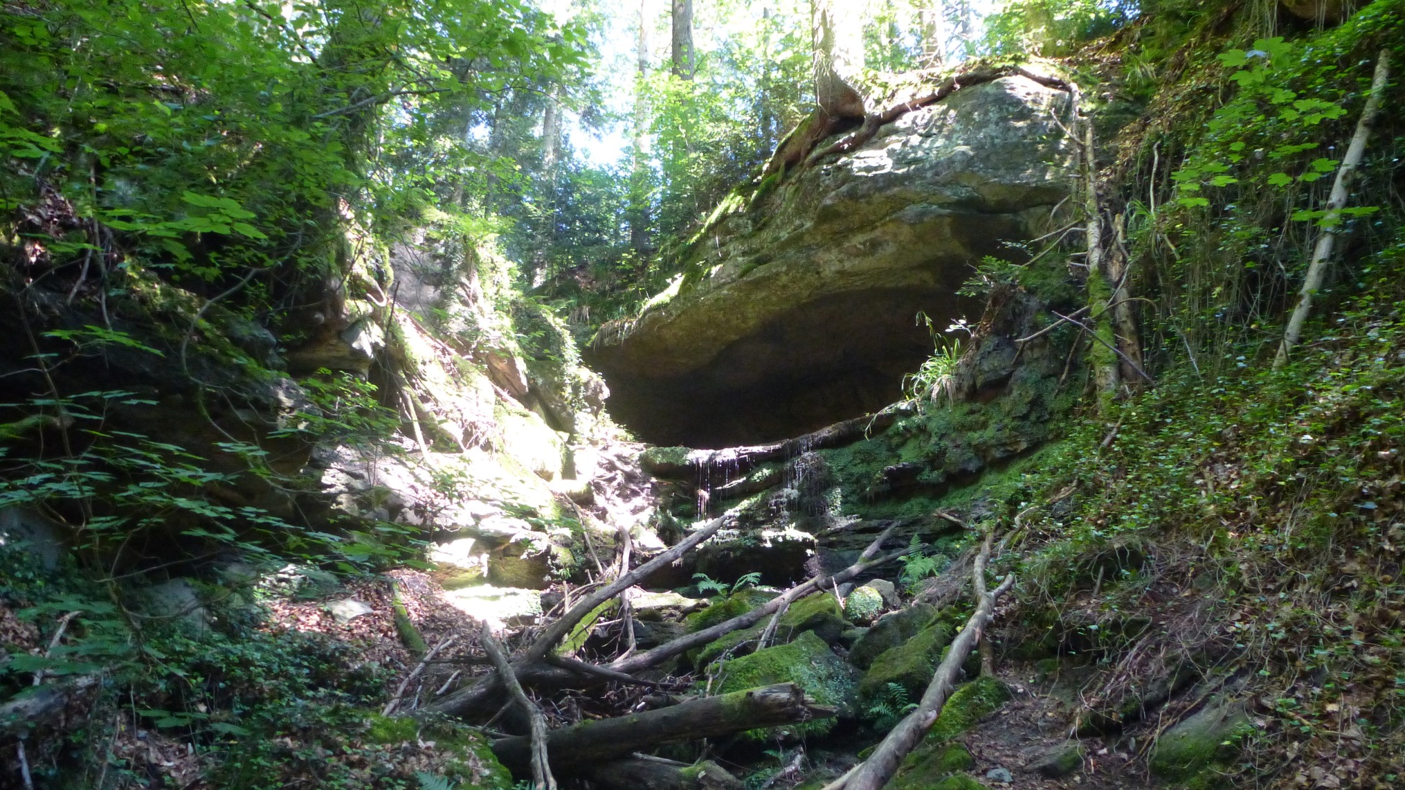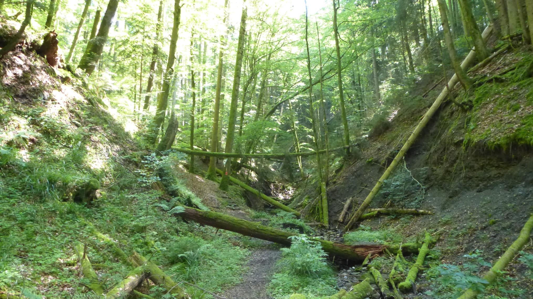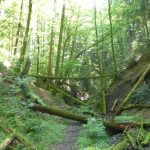 Vorbei am See wandern wir auf Land- und Forstwirtschaftswegen nach Unterneustetten. Von da aus geht es in die Mordklinge. Diese Klinge hat ihren besonderen Reiz in der Unberührtheit. Früher hat da mal ein markierter Wanderweg durchgeführt – aber dieser ist seit Jahren aufgelassen und wird nicht mehr gepflegt. So müssen zahlreiche liegende und hängende Baumstämme überwunden werden, teilweise führt der Weg durchs Bachbett und es sind kleine Kraxeleinlagen erforderlich. Bei Nässe ist der Weg durch die Klinge zu rutschig, eine Umgehung ist aber möglich.